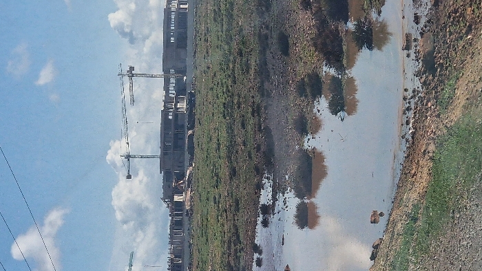 The image displays an outdoor scene in Ain Chkef, Morocco, under a blue sky with scattered white cumulus clouds. The foreground consists of a dirt slope with patches of green grass, transitioning into a muddy field. This field contains multiple large, irregular puddles of murky brown water, reflecting the sky and surrounding vegetation. Small, dark green bushy plants are interspersed within the muddy ground and around the puddles. Several rocks are visible along the edges of the puddles and on the drier ground. In the midground, beyond the waterlogged field, an extensive construction site is visible. It features multiple multi-story buildings in various stages of concrete frame construction. Three tower cranes are prominently positioned above these structures; two are fully visible with their jibs extended horizontally, and a third is partially visible on the far left. No individuals or active machinery are discernible in either the field or on the construction site. Overhead power lines or cables stretch across the upper left portion of the sky.