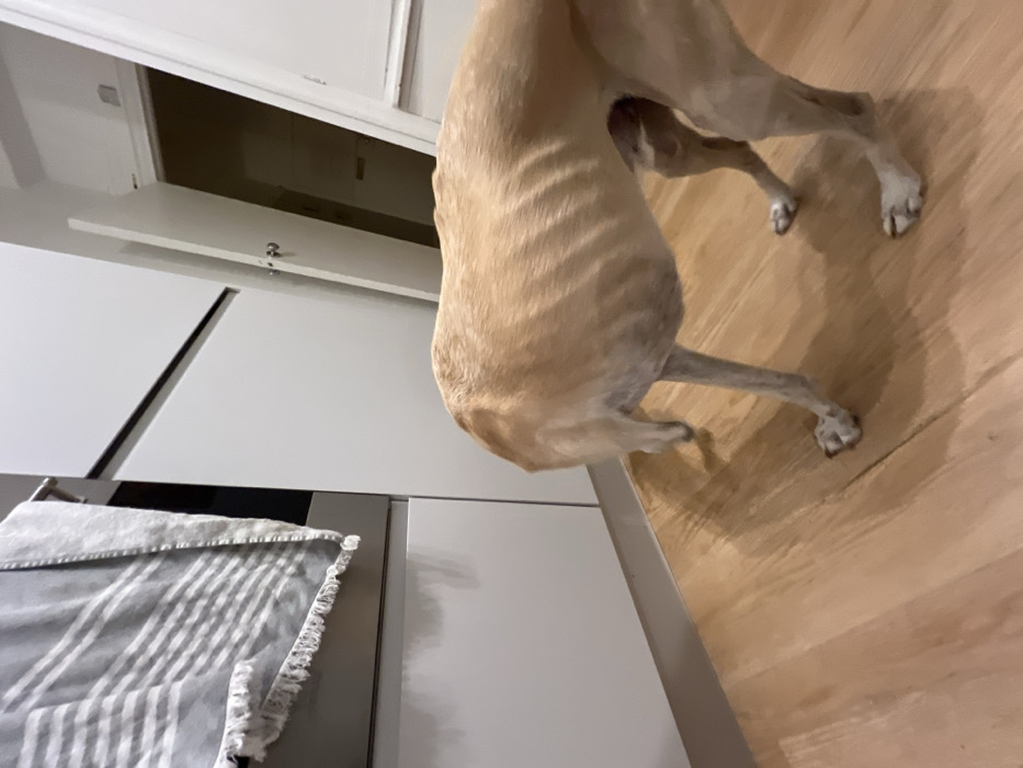 A cream-colored dog stands in a kitchen. Its spine is visible through its fur. The dog's body partially obscures white kitchen cabinets. A striped gray and white towel hangs on a rack. The floor is made of light-colored wood. The camera angle is tilted, giving a distorted view of the room.