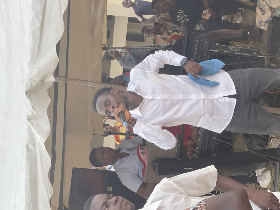 A singer in a white shirt sings into a microphone while holding a blue object. Band members play instruments behind him. The singer wears dark pants and a watch. Other people are seated on the stage and in the background, partially obscured by a tent. A sound system is visible behind the singer.