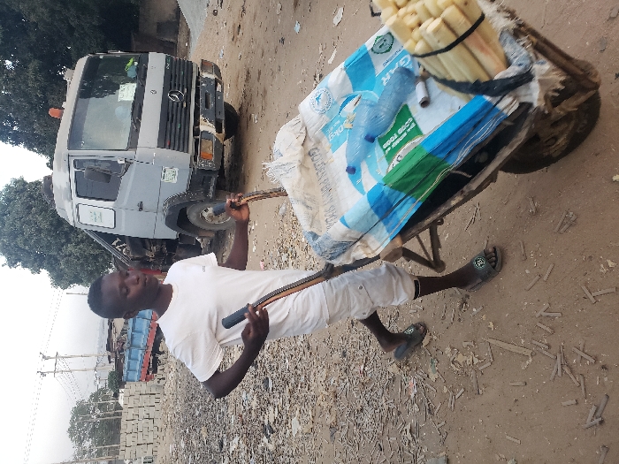 A man in a white t-shirt and shorts pulls a cart loaded with bundles of sugar cane. The cart is also laden with a white and blue bag. He wears sandals. The scene appears to be a dusty, possibly semi-urban area. A gray Mercedes truck is parked in the background, along with piles of concrete blocks and other vehicles. The ground is covered in debris.