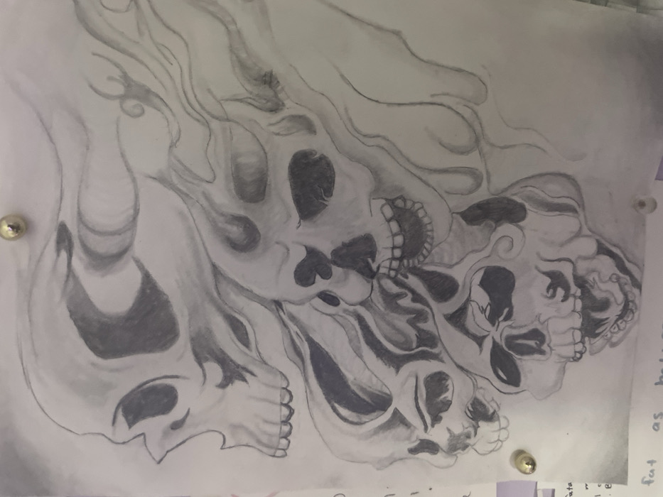 charcoal sketch of three stylized skulls surrounded by swirling flame-like shapes. Each skull displays varying levels of detail, some with open mouths revealing teeth. The shading gives depth and dimension to the skulls and the surrounding flames. The drawing is on a sheet of paper pinned to a surface.