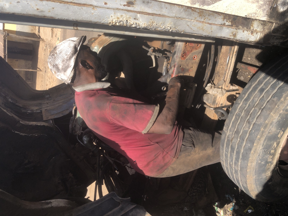 An adult male is observed performing mechanical work on a heavy-duty vehicle in an outdoor environment in Kufena, Nigeria