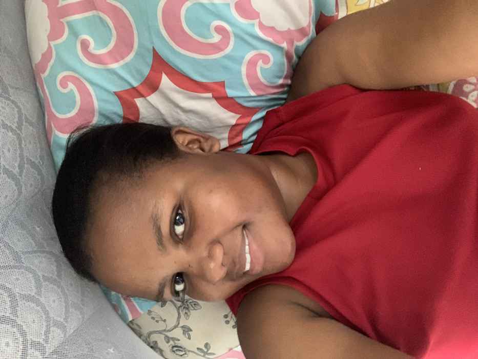 An adult female, with dark skin and dark hair, is pictured smiling directly at the camera while lying on her back in a bed within a domestic setting in Dar es-Salaam, Tanzania