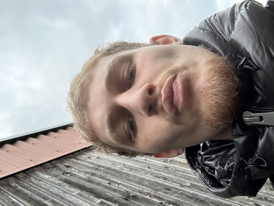 A young adult male, with light blonde, curly hair, blue eyes, a blonde mustache, and a goatee, is depicted in a close-up, direct-facing portrait, likely a selfie