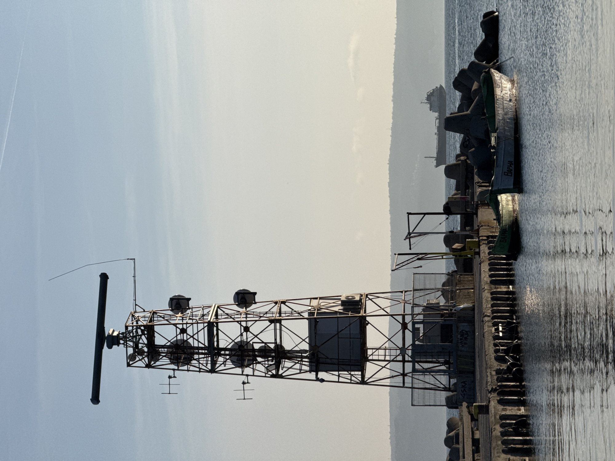 The image depicts a maritime scene at the Port of Varna, Bulgaria. In the foreground, calm water reflects the surrounding structures. A concrete pier with wooden pilings extends horizontally, featuring large grey concrete tetrapods along its edge and partially submerged in the water. Two small, light-colored utility boats are moored to the pier; one boat clearly displays "ВАРНА" (Varna) painted on its hull. Dominating the left side of the frame is a tall, rust-colored metal lattice tower. This tower is equipped with a rotating radar antenna at its apex, multiple dish antennas at various levels, and enclosed equipment compartments. Below the tower, the pier surface shows graffiti, including "ВАРНА" and "VARNA FIRM". In the mid-ground, a large cargo or tanker ship is visible on the horizon, silhouetted against the bright sky. Further in the background, a low-lying landmass or distant coastline extends horizontally. The sky is clear, pale blue, with a single faint contrail visible in the upper left quadrant. The scene is illuminated by natural light, casting reflections on the water and creating a slight silhouette effect on the distant ship and the tower. No individuals are visible in the frame.