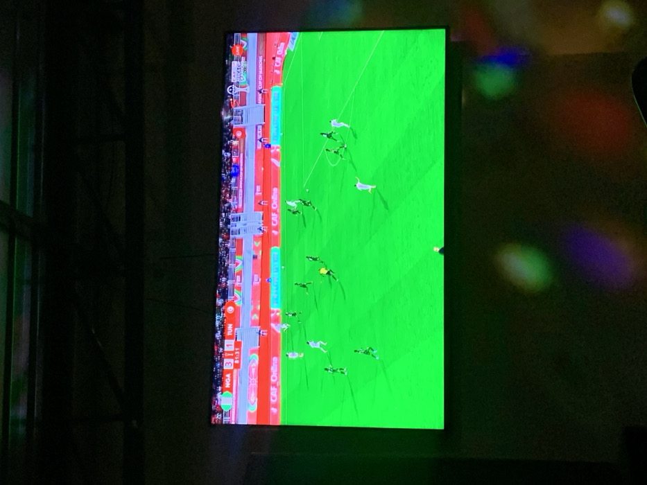 A television displays a soccer match. The screen shows a green field with multiple players in white and green uniforms. On the left side of the screen, there's a scoreboard displaying "NGA 3-1 TUN," suggesting Nigeria is winning against Tunisia. The game is at 81:31. The TV is mounted on a dark wall. A multicolored light source is visible on the right. The overall lighting is dim.