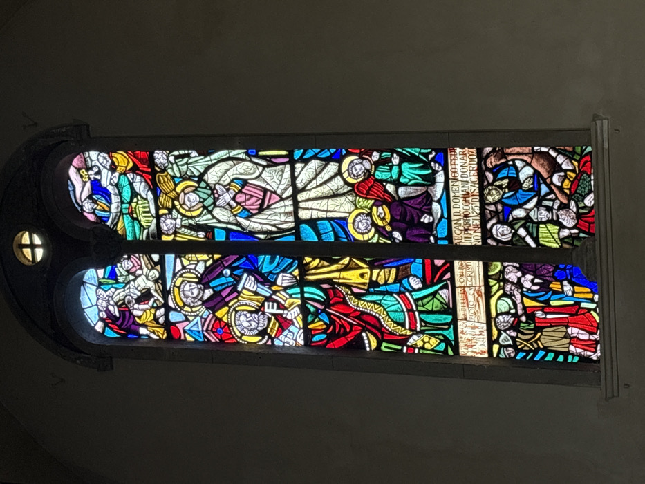 The image depicts a tall, arched stained-glass window within the Duomo di Foligno (Cathedral of San Feliciano) in Foligno, Italy. The window is composed of vibrant, multi-colored glass set within a dark grey stone framework against a plain, light grey interior wall. A small, quatrefoil-shaped window is positioned at the apex of the arch. The main window is divided vertically into two lancets, each containing multiple horizontal panels depicting various religious scenes with figures wearing halos, indicative of saints or divine beings. * **Upper Registers:** The topmost panels are less distinct. The upper left shows multiple figures in celestial settings. The upper right depicts figures, one possibly Christ-like, interacting in a heavenly context, with elements suggesting clouds or a divine realm. * **Middle-Upper Registers:** * The left lancet features a prominent, bearded figure with a halo, clad in purple and blue robes, holding a staff or scroll-like object. Below him, another bearded figure with a halo, in red and green robes, firmly grasps a large golden key, identifiable as Saint Peter. * The right lancet displays a tall, slender figure with a halo, dressed in flowing white and pink garments, with hands clasped in prayer or devotion. This figure is flanked by smaller angelic figures with wings. * **Middle-Lower Registers:** Below the main figures, both lancets feature smaller, seated angelic figures with halos and wings, depicted in purple and green robes. * **Bottom Registers:** * The lower left panel portrays a dynamic group scene. A central figure in red and green interacts with multiple individuals, possibly a crowd, in various colored robes. The interaction appears to be a sermon or a miracle. * The lower right panel shows a more tumultuous scene. A figure in blue and yellow engages with prostrate or struggling individuals, one of whom is entangled with a brown, beast-like creature or demon, suggesting an exorcism, a healing, or a struggle against evil. * **Inscriptions:** Latin text is visible on horizontal bands beneath the middle-upper registers. The right inscription reads, "DECAN. D. DOMENICO FEDE III PARROCCHIANI DONARONO NEL 25 DI SACERDOZI" (Dean D. Domenico Fede and the parishioners donated on the 25th anniversary of priesthood), confirming the ecclesiastical context and the location in Foligno Cathedral. The window is backlit, allowing natural light to pass through the colored glass, illuminating the detailed artistry and vibrant hues of the religious narrative.