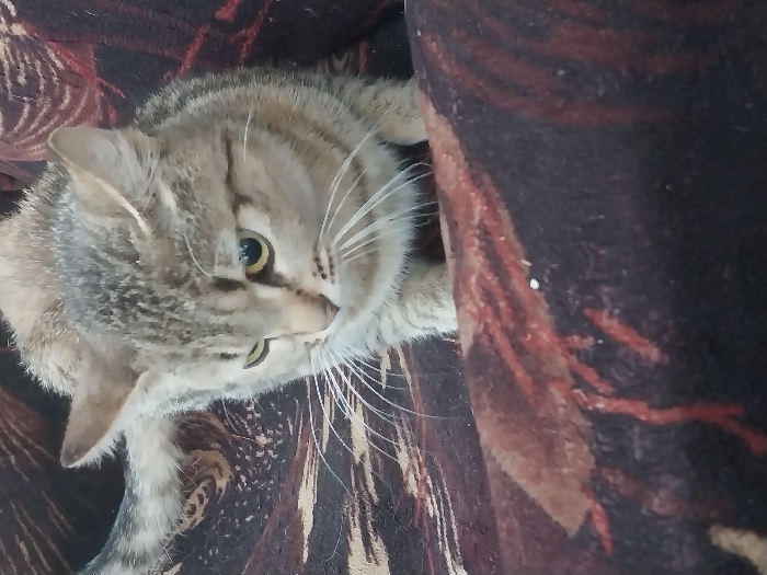 A light brown and gray tabby cat looks upward, its head tilted. The cat's bright yellow eyes are partially open, and its long white whiskers are splayed out. The cat is nestled amongst upholstery with a dark brown and red patterned design. The fabric appears to have a velvety texture. The overall composition emphasizes the cat's inquisitive expression.