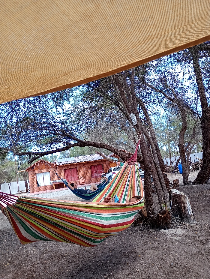 The scene depicts an outdoor resting area in Pozo Almonte, Chile
