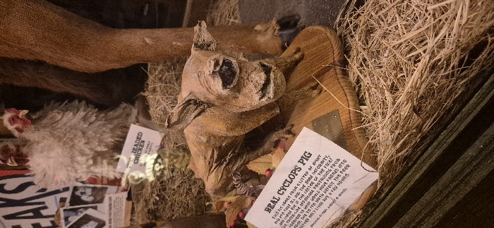 The image displays an interior scene from the Museum of the Weird, located at 412 E 6th St, Austin, Texas, United States of America. The central subject is a taxidermied or preserved cyclopic piglet, presented as a "REAL CYCLOPS PIG." This light brown specimen, with a single large eye socket on its forehead and a distorted snout, rests on a small oval wooden base. A white informational sign in front of it provides descriptive text, partially obscured. In the upper left background, a taxidermied two-headed chicken with light-colored feathers and red combs stands on a bed of hay, with a visible sign for "HEADED CHICKEN" and a large "FREAKS" banner. To the right of the piglet, the lower leg and hoof of a large, dark brown, taxidermied ungulate are visible. The entire display is set within a dimly lit environment featuring hay and rustic elements, consistent with a sideshow or curiosity exhibit.