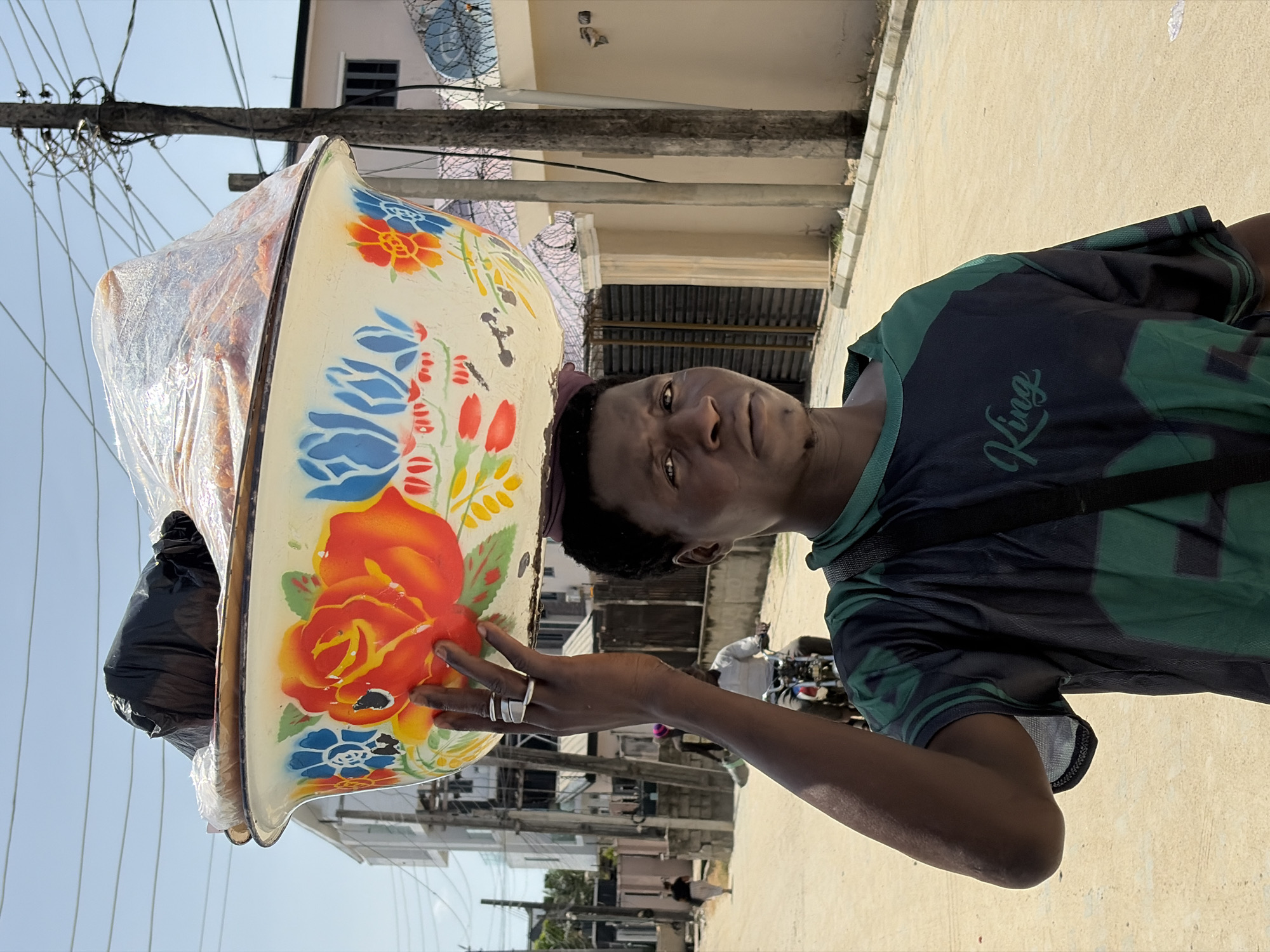 A street scene in Igboefon, Nigeria, features a young man with dark skin wearing a black and green t-shirt with the word "King" printed on it. He is carrying a large, round, shallow basin on his head. The basin is decorated with colorful floral designs, including red roses, blue flowers, and orange flowers. The contents of the basin are obscured by plastic wrap. The man is holding the edge of the basin with his left hand, which has silver rings on two fingers. He is looking directly at the camera. The background includes buildings, power lines, and a street with a parked motorbike and pedestrians in the distance. The sky is light blue, indicating daylight. The ground appears to be concrete or pavement.
