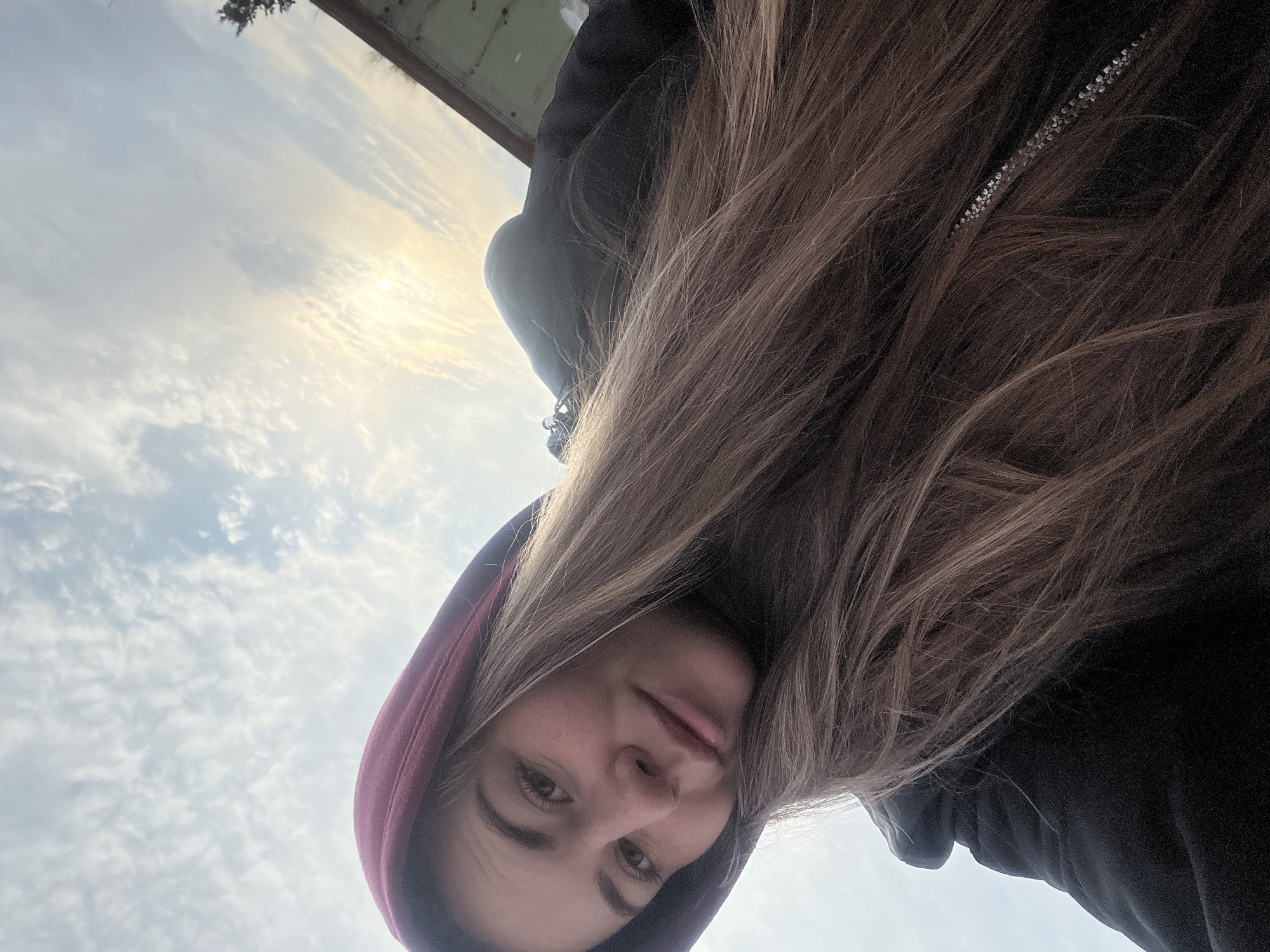A tilted, close-up selfie captures a young woman with long, light brown hair wearing a burgundy hooded sweatshirt and a black jacket