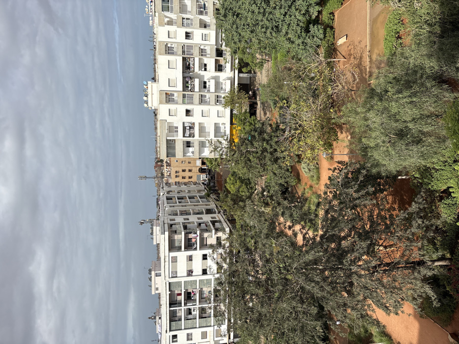 An elevated, static daytime image captures an urban park setting bordered by multi-story residential buildings under a predominantly overcast sky. The foreground and midground consist of a park featuring numerous trees of varying heights and foliage density, interspersed with green shrubs. Pathways and exposed ground are composed of reddish-brown dirt or gravel. A solitary light post stands on a path, and a light-colored bench or structure is situated on a bare patch of ground in the mid-right. A small area of wet ground or standing water is visible in the lower right. Two prominent, light-colored residential apartment buildings flank a central thoroughfare in the background. Both buildings feature multiple balconies, some displaying hanging laundry. Their rooftops are equipped with various satellite dishes and several cellular tower antennas. Beyond these, additional buildings with different architectural styles and colors, including a tan-colored structure, line the distant street. Yellow awnings or signs indicative of commercial establishments are visible at the ground level of some buildings. A single, indistinct human figure is faintly visible walking on a path in the lower-left quadrant of the park, partially obscured by trees. The sky is uniformly grey with dense cloud cover. The specific city and country are not identifiable from the image.
