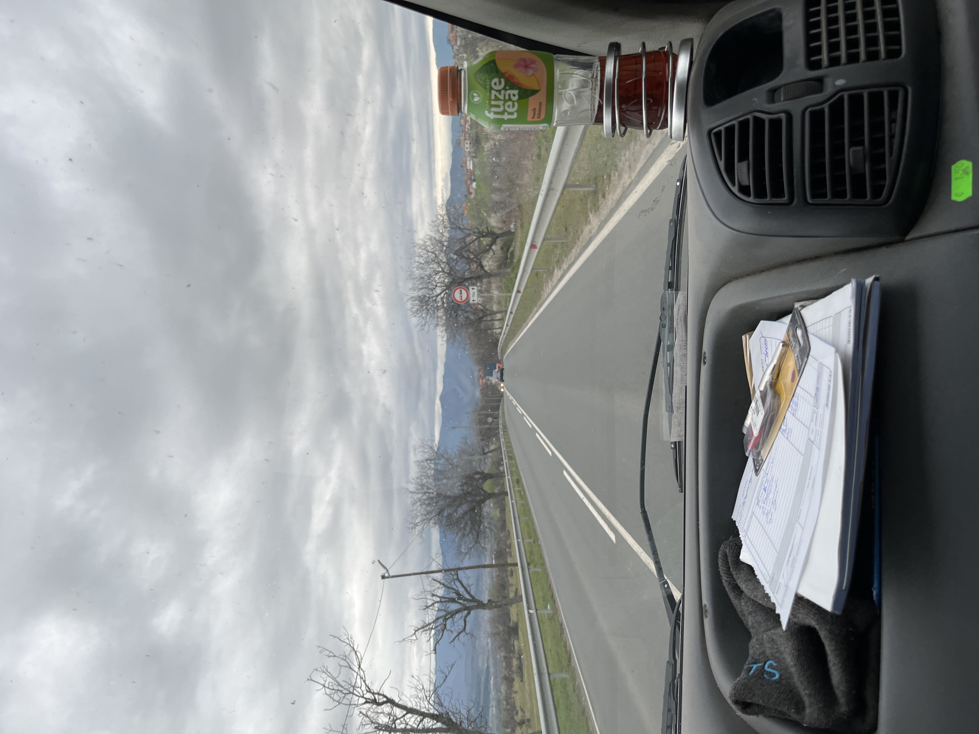 The image presents a view from inside a vehicle, likely a car, driving along a road near Anevo, Bulgaria. Outside, the landscape is dominated by an overcast sky, with bare trees lining the road. A road sign with a red circle and white horizontal bar is visible in the distance, along with a car further down the road. The road has double white lines dividing the lanes. Inside the vehicle, a bottle of "Fuze Tea" is held in a drink holder. To the right, a dashboard air vent and a storage compartment containing papers and a dark-colored glove with the letter "S" are visible.