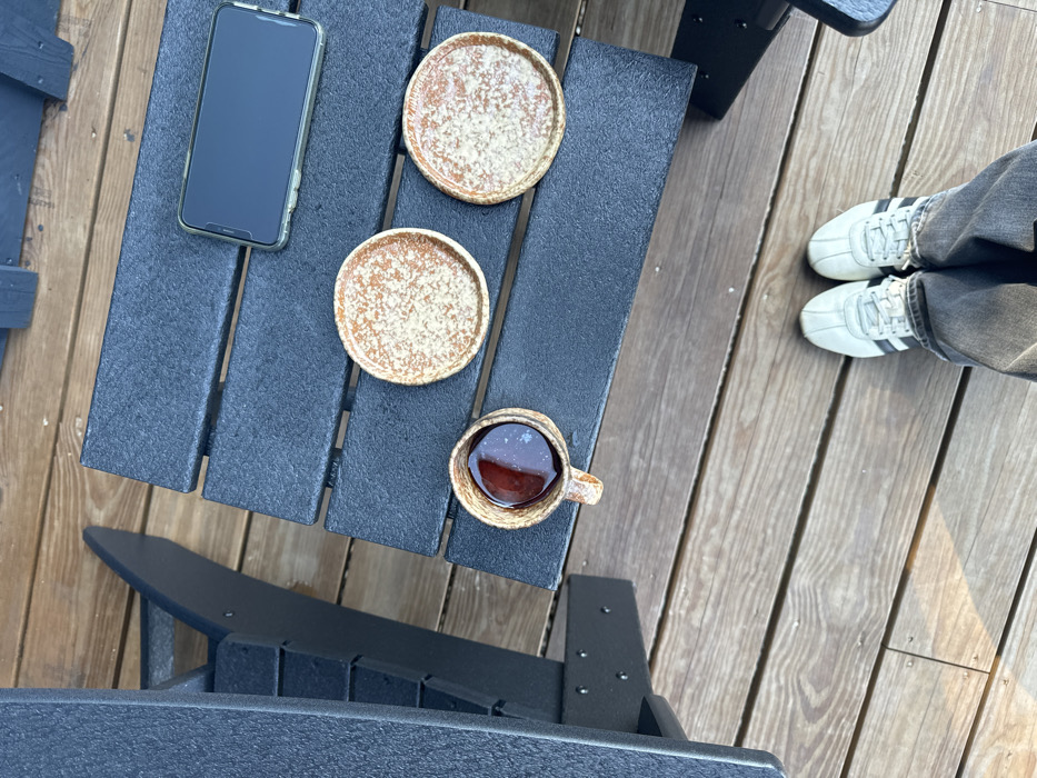 The image depicts an overhead view of an outdoor scene on a wooden deck in Otego, United States. In the foreground, the lower legs and feet of an individual are visible. The individual wears dark gray jeans and white athletic shoes with three black stripes on the lateral sides. Directly in front of the individual, occupying the mid-ground, is a dark gray, slatted outdoor table. On the table, from left to right, are a speckled ceramic mug containing a dark liquid, two matching speckled round ceramic coasters or small dishes, and a light-colored smartphone with a clear case, positioned horizontally with its screen off. Parts of two dark gray slatted chairs are visible on the left and right edges of the frame, flanking the table. The wooden deck flooring shows distinct grain patterns and is illuminated by natural light, casting subtle shadows. No discernible actions or interactions beyond the static arrangement of objects are depicted.