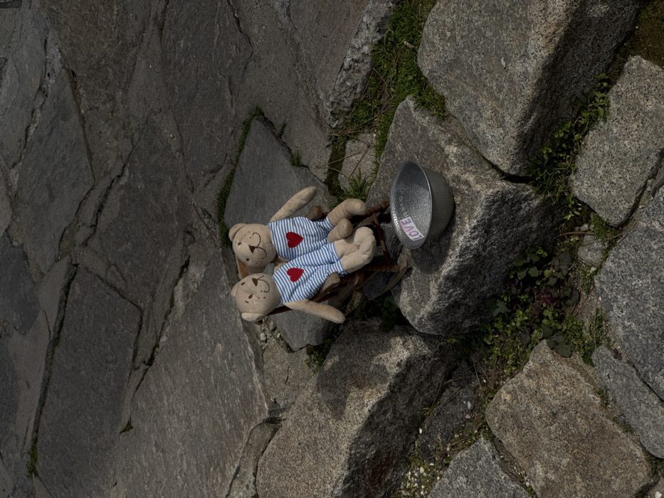 The image depicts a static outdoor scene in the Old Town of Plovdiv, Bulgaria. Two light-brown teddy bears are seated side-by-side on a miniature dark brown wooden rocking chair, positioned on an elevated rough-hewn stone block. Both bears wear striped blue and white shirts, each featuring a prominent red heart appliqué on the chest. In front of the rocking chair, on a lower adjacent stone block, rests an empty, small, metallic silver-colored bowl. A pink paper strip with the word "LOVE" in white lettering is placed inside the bowl, leaning against its inner rim. The ground surrounding these subjects consists of large, irregularly shaped grey stone pavers and blocks, with small patches of green vegetation and weeds growing in the crevices. No human figures are present, and no actions or interactions are occurring beyond the deliberate arrangement of the objects.