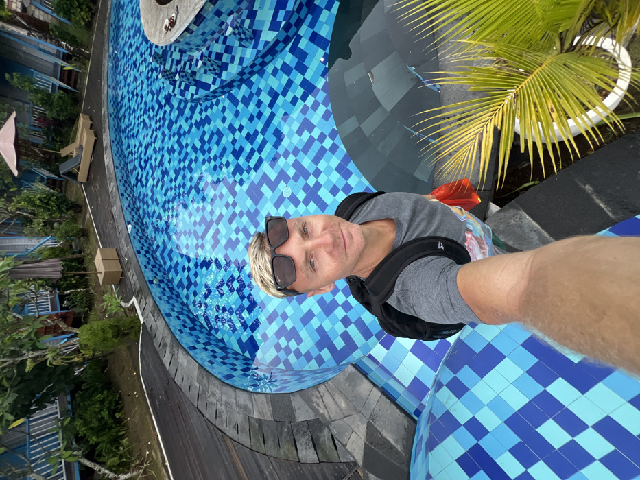 A selfie-style, high-angle shot shows a man with blond hair and sunglasses beside a blue-tiled pool