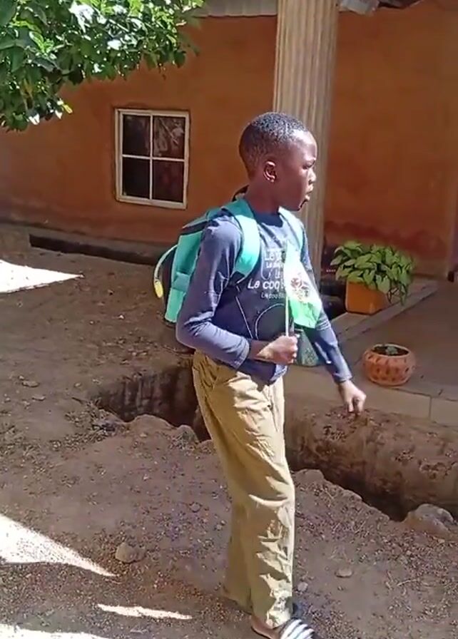 A young boy, likely of African descent, wearing a blue long-sleeved shirt, khaki pants, and black and white sandals, stands outside a house. He wears a blue and green backpack and holds a small Nigerian flag in his right hand. He is walking parallel to a trench dug along the front of the house, using his left hand to maintain balance as he moves. The house is painted in a reddish-brown color with a white window and a small porch supported by white pillars. Several potted plants are visible on the porch. The ground is mostly dirt and gravel. A tree is visible in the upper left corner of the frame, partially obscuring the house. The lighting suggests it is daytime and sunny.