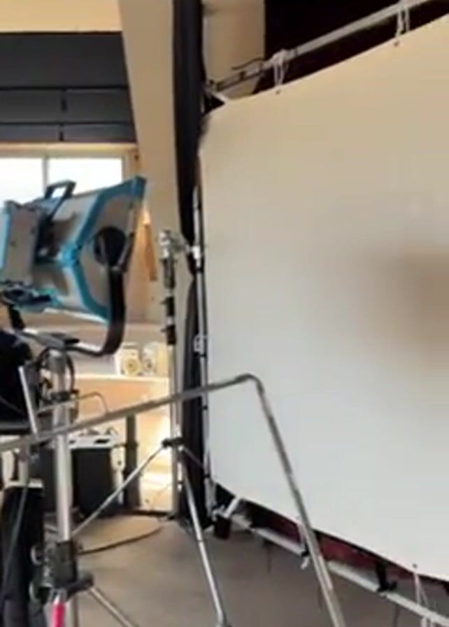 film set with various lighting and camera equipment. The scene includes a large light fixture with a blue frame, a white diffusion panel on a stand, and multiple cameras on tripods. Several crew members are present, some wearing masks, and appear to be discussing something. The environment includes a small elevated platform in the background.