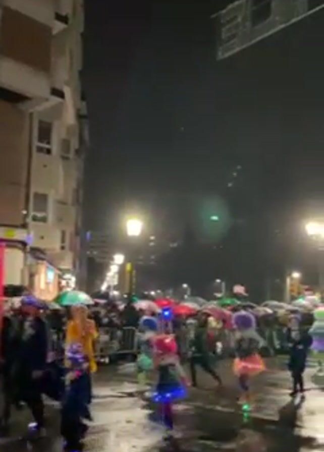 A video captures a nighttime parade scene on a wet city street. Several figures in brightly colored, light-up costumes are dancing in the street, illuminated by streetlights. Many spectators line the sidewalks, most holding umbrellas. A colorful, cube-shaped object on wheels is moving through the parade route. Above the street, a large decorative sign is strung across the road. The scene is further punctuated by the sounds of music.
