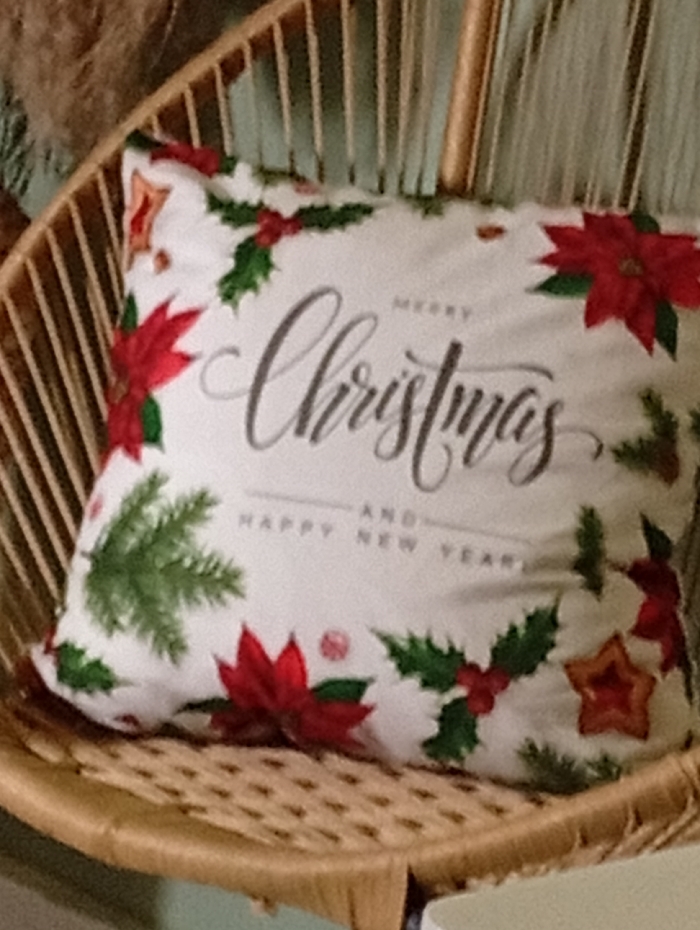 A rectangular decorative pillow, approximately 20x14 inches, is positioned upright within a light-brown woven rattan or wicker chair. The pillow features a white background with "MERRY Christmas AND HAPPY NEW YEAR" printed in a calligraphic grey font for "Christmas" and smaller grey sans-serif text for the remaining words. The pillow is adorned with various Christmas-themed motifs, including red poinsettia flowers, green holly leaves with red berries, green fir or pine branches, and occasional light-brown star-shaped objects, possibly ornaments or cookies, along with small red and white striped circular details. The chair's backrest, composed of vertical light-brown slats, is visible behind the pillow. A blurred, light-brown, textured object is partially visible in the upper left background, alongside a muted blue-green wall or paneling with subtle vertical lines. No individuals or active interactions are depicted. This scene is located in Abuja, Nigeria.