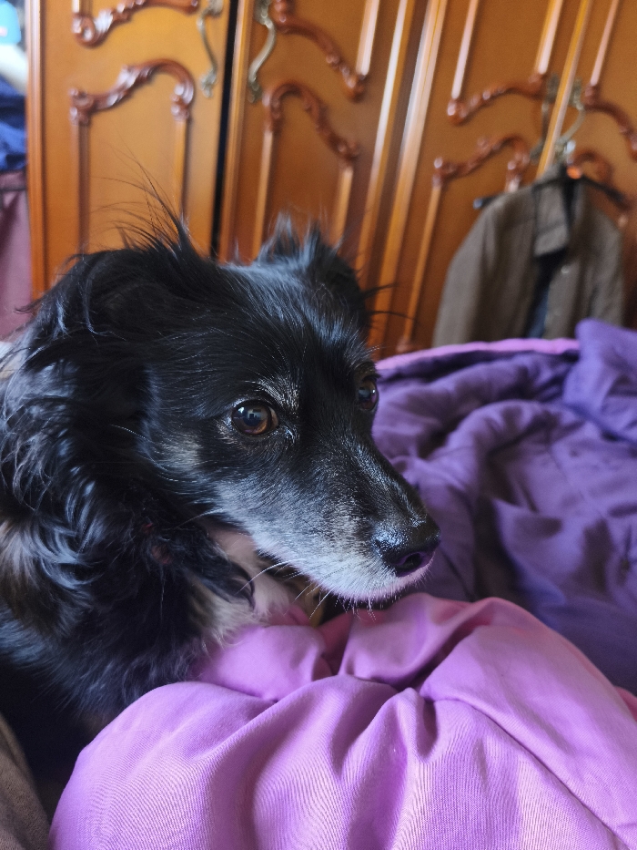 - "The image displays a black-furred dog with a greying muzzle and brown eyes, resting on vibrant purple, crumpled bedding" by FM-NDxit2, licensed under CC BY 4.0