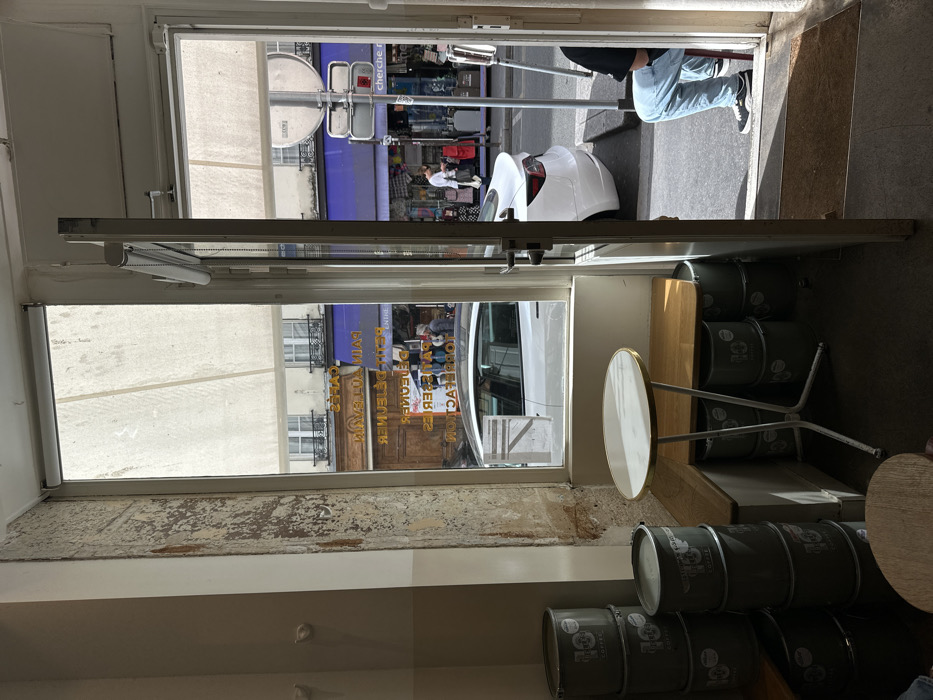 interior of a cafe in Issy-les-Moulineaux, France, located at coordinates 48.849 latitude and 2.325 longitude. The cafe is furnished with a wooden bench and a white marble-topped table. On the bench are stacks of grey metal canisters. The cafe is located near a busy street. A white car is parked outside the cafe. People are walking on the sidewalk, and a man is sitting in the cafe doorway wearing a blue shirt and jeans. The street has a sign with the words "cherchez..." written on it. The cafe is in the center of the image. Sunlight streams in through a large window behind the table, illuminating the interior. A sign with French writing is visible on the wall to the right of the window. The cafe's exterior is visible through a large glass door, open to the street. The door is closed, revealing an interior space that includes a metal rack and other objects. The cafe appears to be empty, and the people are not interacting with one another.