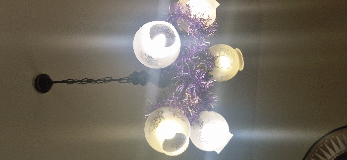 The image displays an indoor scene in Rouvroy, France, focused on a centrally positioned chandelier-style light fixture. The fixture hangs from an off-white ceiling via a dark metal chain and circular mounting cap. It features five illuminated bulbs, each enclosed within a frosted, bell-shaped glass shade adorned with dark, ornate scrollwork patterns. A festive purple tinsel garland is wrapped around the central structure of the chandelier. The bright light emitted from the bulbs creates highlights and illuminates the surrounding plain, light-colored wall and ceiling. A segment of a circular, decorative object with radial patterns in brown and white is partially visible in the lower-left portion of the frame. No individuals are present.
