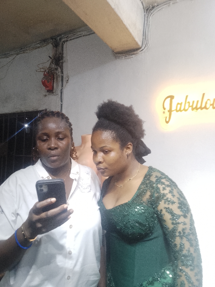 An indoor scene in Onitsha, Nigeria, depicts two women interacting with a smartphone