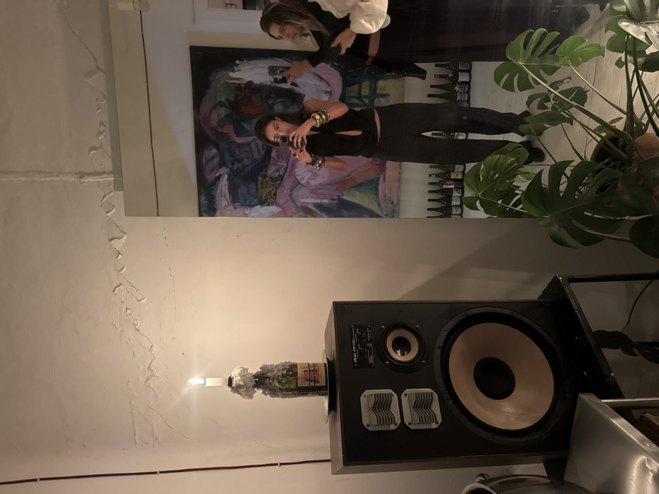 A large speaker sits below a mirror reflecting two women taking photos. The left woman wears a black outfit with gold bracelets, while the right woman wears a white blouse and black pants. An abstract painting and a wine rack are also visible in the mirror, along with a monstera plant. A candle sits on top of a wine bottle, which is placed atop the speaker. The background wall is white and shows some exposed brick.