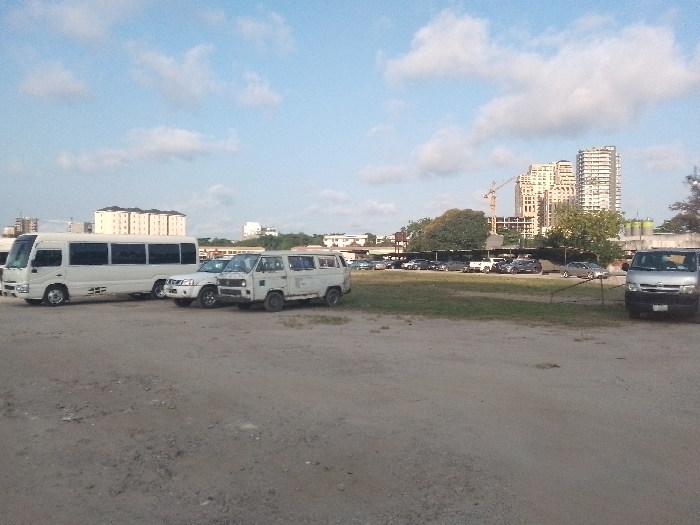The image captures an unpaved, light-brown open parking area in Falomo, Nigeria, under a blue sky with scattered white clouds