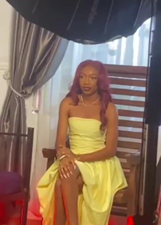 A woman in a strapless yellow dress sits in a wooden chair in a room. The room is set up for a photoshoot with lighting equipment visible. She is adjusting the top of her dress. Rose petals and crumpled paper are scattered on the floor around the chair. There is a bed visible in the background.