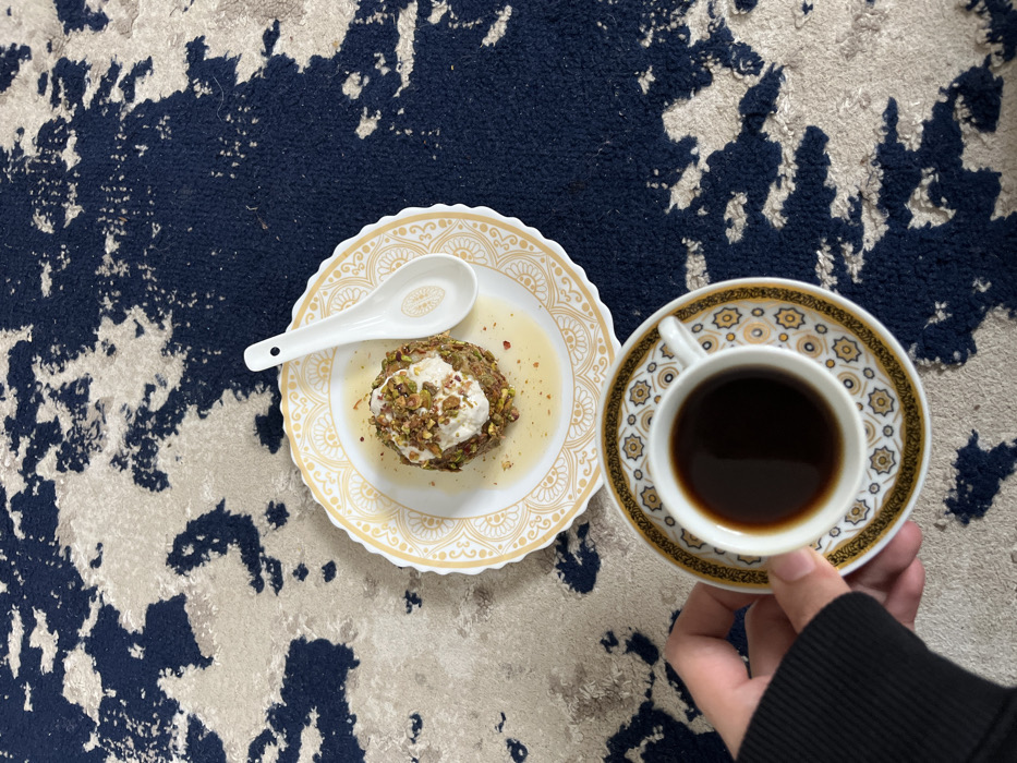 An overhead view depicts a dessert and a cup of coffee arranged on a patterned carpet, located in Nuseirat, Palestinian Territory