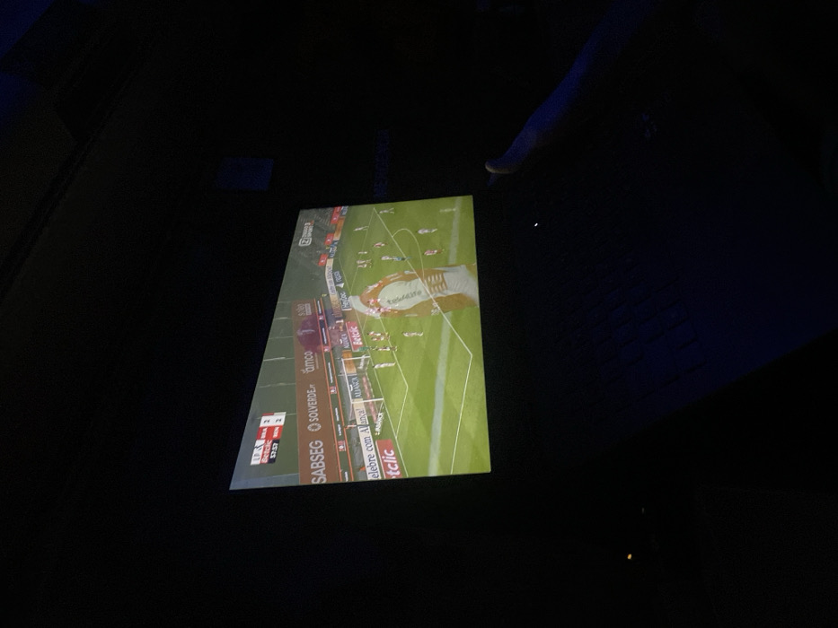 A low-lit room displays a soccer game on a screen. The broadcast shows a green field and players in red and white uniforms. On the lower left corner of the screen, match statistics are visible. An obscured leg is present in the upper right, suggesting someone is watching the game. Logos and advertisements line the field's perimeter on the display.