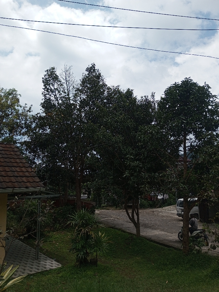 The image depicts an outdoor scene in Tagtse Tashidingkha, Bhutan, under an overcast sky with visible white and grey clouds. Three dark utility lines traverse the upper portion of the frame. The left foreground shows the light-colored wall and brown tiled roof of a building, with a grey paved patio featuring interlocking pavers immediately adjacent to it. A vibrant green lawn, interspersed with various shrubs including a prominent spiky-leaved plant, occupies the lower-left and central foreground, sloping gently upwards towards the right. Dominating the midground and extending into the background are numerous tall trees with dense, dark green foliage, some obscuring distant structures. One slender tree in the upper-left-midground is largely bare of leaves. A light-colored paved or gravel road cuts across the mid-right. On this road, a white van is parked on the right, partially obscured by a tree. Adjacent to the van, a person wearing a light-colored hoodie or jacket is seated on a light-colored scooter or motorcycle, facing away from the camera. The scene is illuminated by natural daylight, casting soft shadows. No other individuals or specific interactions are discernible.