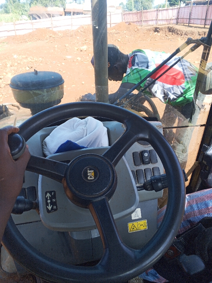 The interior of a CAT construction vehicle reveals a large, black steering wheel with the company logo prominently displayed. A worker wearing a t-shirt with geometric shapes is visible outside the cab, possibly attending to something on the machinery. The background features a construction site with exposed dirt and barriers. The vehicle's control panel and dashboard are also visible, including buttons, switches, and safety stickers.