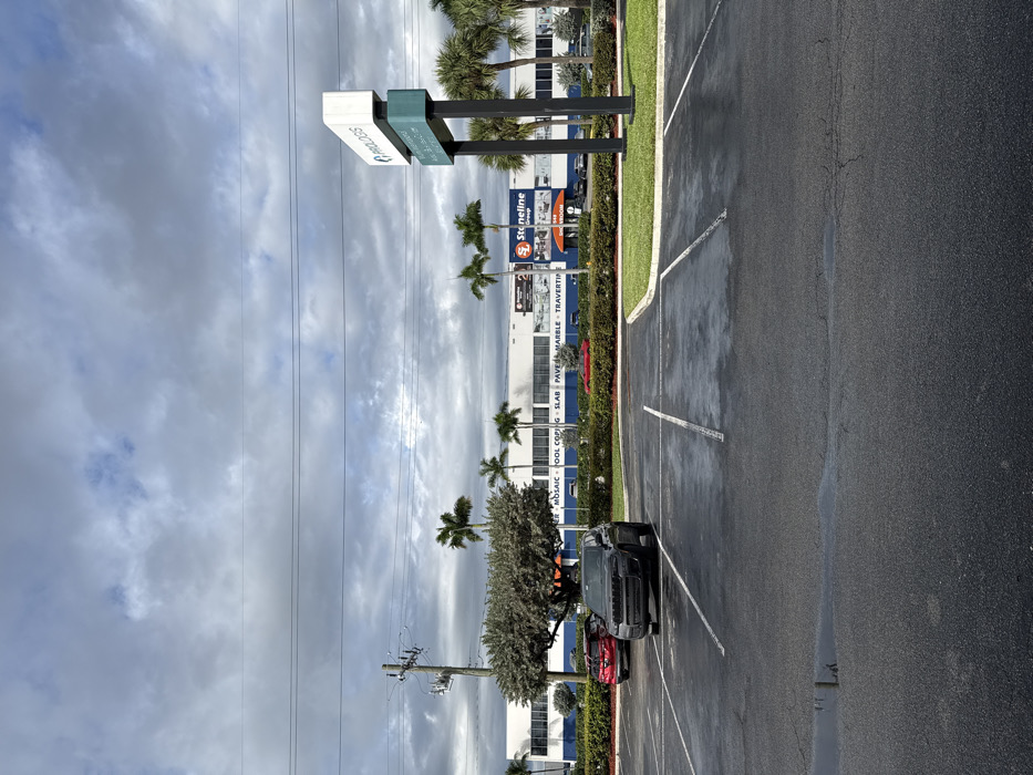 A vertically-oriented outdoor shot captures a parking lot beside a building with a "Stoneline" sign. A grey truck and red car occupy parking spaces. Lush greenery separates the lot from the building. Palm trees and utility poles line the periphery. The sky is filled with white and grey clouds.
