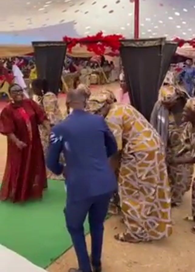 People are dancing at what appears to be an outdoor event. The event is under a large white tent, with a green carpet and red decorations in the background. A man in a dark blue suit and several women in matching yellow and white patterned outfits are dancing together. A woman in a long red dress also dances with them. More people are sitting in the background. The camera is handheld and moves around slightly.