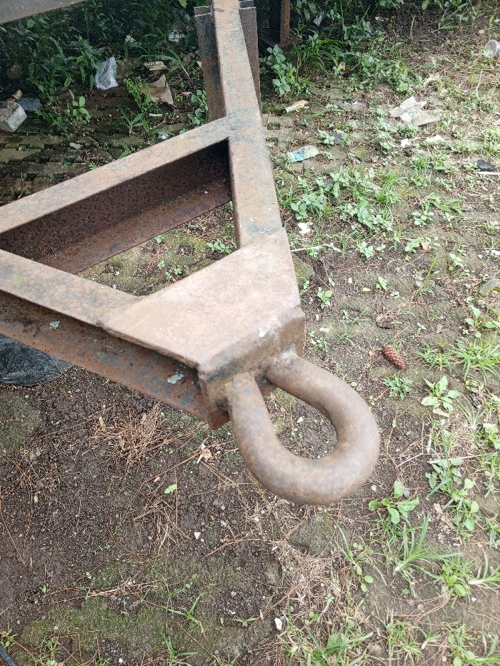 A close-up shot presents a rusty metal frame, likely part of a trailer hitch or similar apparatus