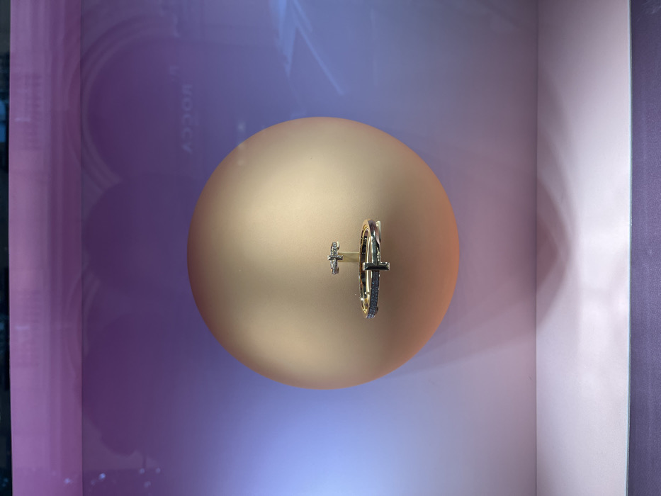 The image displays a retail jewelry showcase. A large, matte gold-colored spherical object serves as the central display element, positioned against an illuminated gradient background transitioning from light blue on the left to purple on the right. Mounted on the sphere are two gold-toned jewelry pieces, each featuring a horizontal bar motif and encrusted with small, dark-colored stones. A bangle or bracelet is positioned horizontally on a transparent support, while a matching ring is vertically displayed on another transparent support slightly above and behind it. Reflected text in the upper right background reads "ACCOЯ", indicating the brand "ROCCA". The base of the display consists of a light purple-grey horizontal surface with a darker purple-grey edge below. This display is located at the Rocca 1794 boutique in Galleria Cavour 1/e, Bologna, Italy.