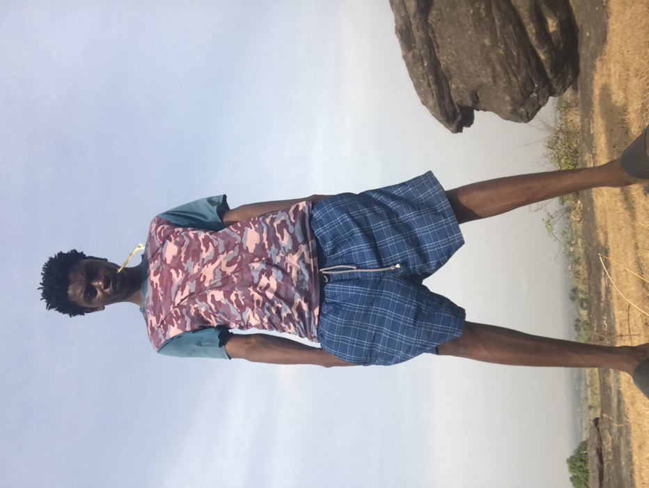 A young man stands outdoors with legs spread wide, wearing a camouflage shirt, blue plaid shorts, and sandals. He holds a twig in his mouth. The background includes a cloudy sky, a large rock formation, and dry, grassy terrain in the distance. The image appears to be taken from a low angle and rotated counter-clockwise.