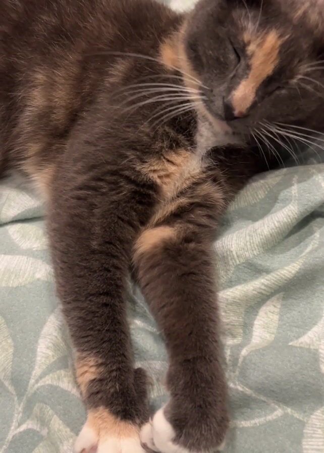 - "close-up of a sleeping cat, likely indoors, resting on a light green patterned blanket" by FM-2hcL22, licensed under CC BY 4.0