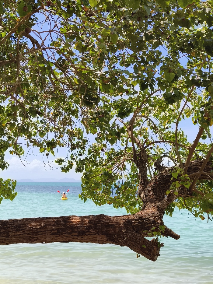 A vibrant scene unfolds with a sprawling tree in the foreground, its thick, gnarled trunk extending horizontally over a turquoise sea. The canopy of lush green leaves filters sunlight, creating a dappled effect. In the distance, a lone kayaker with red paddles glides across the water, adding a touch of human presence to the serene seascape. The sky is a clear blue, visible through gaps in the foliage, completing the picture of tropical tranquility.