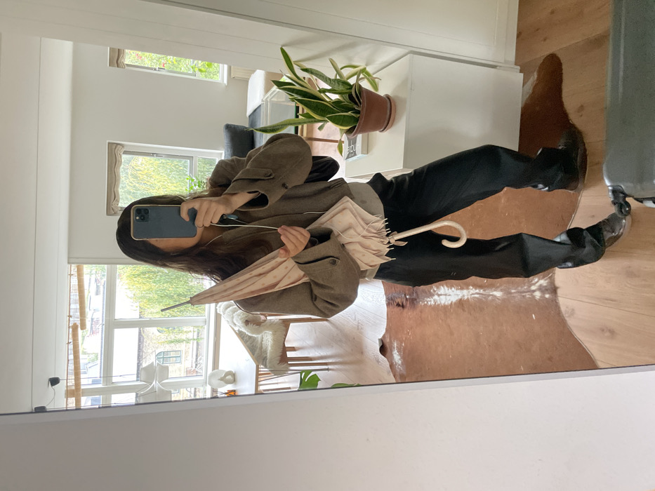 An individual is depicted in a full-length mirror selfie taken within a residential interior in Copenhagen, Denmark. The subject's face is obscured by a dark-cased smartphone, held with both hands, revealing dark hair and white wired earbuds. They wear a brown/taupe bomber jacket over a light grey undershirt, dark trousers, and dark shoes. In their left hand, they hold a light pink, folded umbrella with a subtle dot pattern and a curved light handle. The reflected interior shows a light-toned wooden floor, partly covered by a large brown and white cowhide rug. A dining area in the background features a wooden table with chairs, one adorned with a white faux-fur throw, and a white abstract decorative object. To the right, a white cabinet holds books and a terracotta-potted snake plant. Beyond this, a dark sofa or seating area is visible. The room has white walls and large windows fitted with light-colored blinds. Through the windows, an exterior view consistent with an urban European setting in Copenhagen is visible. This includes abundant green foliage from trees or bushes and parts of an older, light-colored building with dark-framed windows.