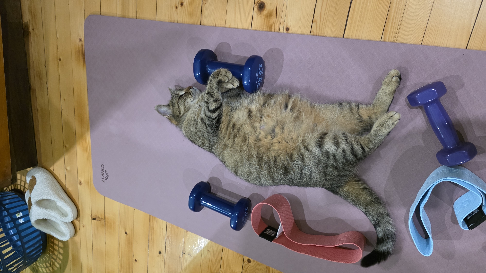 - "The image displays an indoor scene in Staroseltsi, Bulgaria, featuring a striped tabby cat lying supine on a lavender Crivit yoga mat" by FM-3O4tD2, licensed under CC BY 4.0