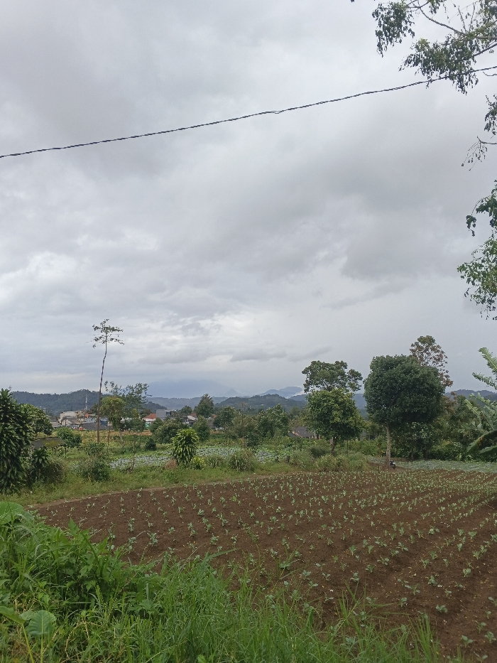 The image depicts an agricultural landscape under an overcast sky, located in Unknown, Nepal. The foreground features green grass and low vegetation along the bottom edge. Immediately behind this, a large field of dark brown soil is visible, meticulously planted with numerous rows of young, light green crops, possibly seedlings. In the mid-ground, a rural settlement is present, characterized by scattered low-rise buildings and numerous trees of varying sizes and foliage densities, including a tall, slender tree to the left and several mature, rounded trees towards the right. A dark, small figure, possibly a person, is observable near the base of a large tree on the right side of the cultivated field. A utility pole or cell tower is faintly visible amidst the distant trees. A single dark power line or wire extends horizontally across the upper portion of the frame, passing through the grey, cloudy sky. The background consists of hazy, vegetated hills and mountains receding into the distance, partially obscured by atmospheric conditions. The overall environment appears calm and pastoral, with no overt actions or interactions immediately evident beyond agricultural cultivation.