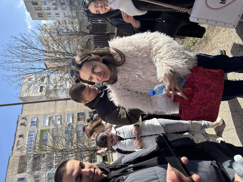 This image depicts an outdoor scene in Silistra, Bulgaria, under bright sunlight with a clear blue sky. A group of approximately seven young adults is visible in the foreground and midground, with additional blurred figures in the background. In the left foreground, a young male with short dark hair, wearing a dark hooded jacket, is partially visible, looking downward at a black smartphone held horizontally in his hand. A second blue plastic water bottle is partially visible at the bottom left. The central figure is a young female with long dark hair, wearing sunglasses on her head, a light-colored turtleneck, and a shaggy, light beige faux fur jacket. She holds a blue "DEVY" brand plastic water bottle in her left hand and a red and orange leopard print handbag in her right hand, looking slightly to her right with a neutral expression. To the left of the central female, a young female in a white puffer vest and glasses is observed looking down at a smartphone in her hands. To the right, a young male in a dark puffer jacket also looks downward. Further right, a young female with dark hair, clad in a black top, holds a small, white cylindrical object near her mouth. She carries a black shoulder bag, and a white studded shoulder bag with "MOSC" partially visible is seen next to her. The background consists of multiple multi-story residential buildings, characterized by concrete construction, various window types, and visible weathering. Bare deciduous trees are present among the buildings. The ground where the individuals are standing is paved, and a dark metal fence or railing is partially visible in the midground.