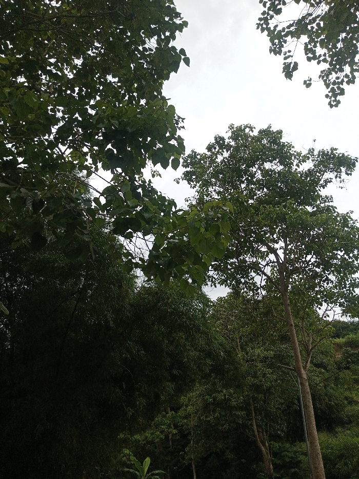 The image depicts a natural environment under an overcast sky within the Hasanparthy mandal, India. The scene is dominated by dense green foliage, observed from a low angle looking upwards. In the upper left, the dark silhouette of broad leaves from a tree is visible against the grey sky. Towards the right, a tall tree with a light-colored, slender trunk extends upwards, its canopy full of green leaves. The midground features a dense, dark green wall of slender-stemmed vegetation, consistent with bamboo or similar growth. A vegetated hillside is visible in the upper right background. No individuals, animals, or man-made structures are present within the frame.