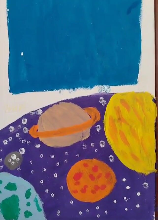 framed painting. The top portion of the painting features a green cactus with a smiley face, blushing cheeks, and a pink flower on its head, set in a blue pot. Below, there is a depiction of space with several planets and white dots representing stars against a purple background. The lower portion of the painting features a yellow zig-zag pattern.