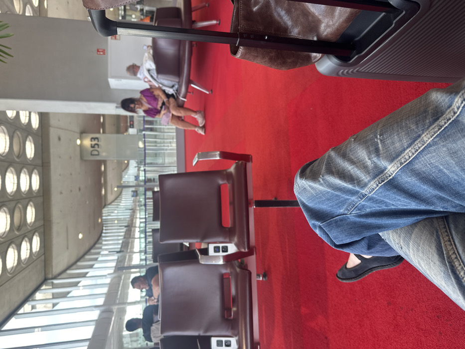 A person wearing blue jeans and black shoes sits in a waiting area at Charles de Gaulle Airport in Roissy-en-France, France (49.005, 2.566). The person is facing towards a row of four brown leather chairs. There is a bright red carpet on the floor, with a suitcase in the foreground. Behind the person, a woman is seated in one of the chairs, while another man sits on the chair next to her. Another man is out of focus in the background, facing the window. The sign above the chairs reads “D53”. The waiting area is situated within a modern airport terminal, with large windows that offer views of the outdoors. The ceiling features a series of round, recessed lighting fixtures.